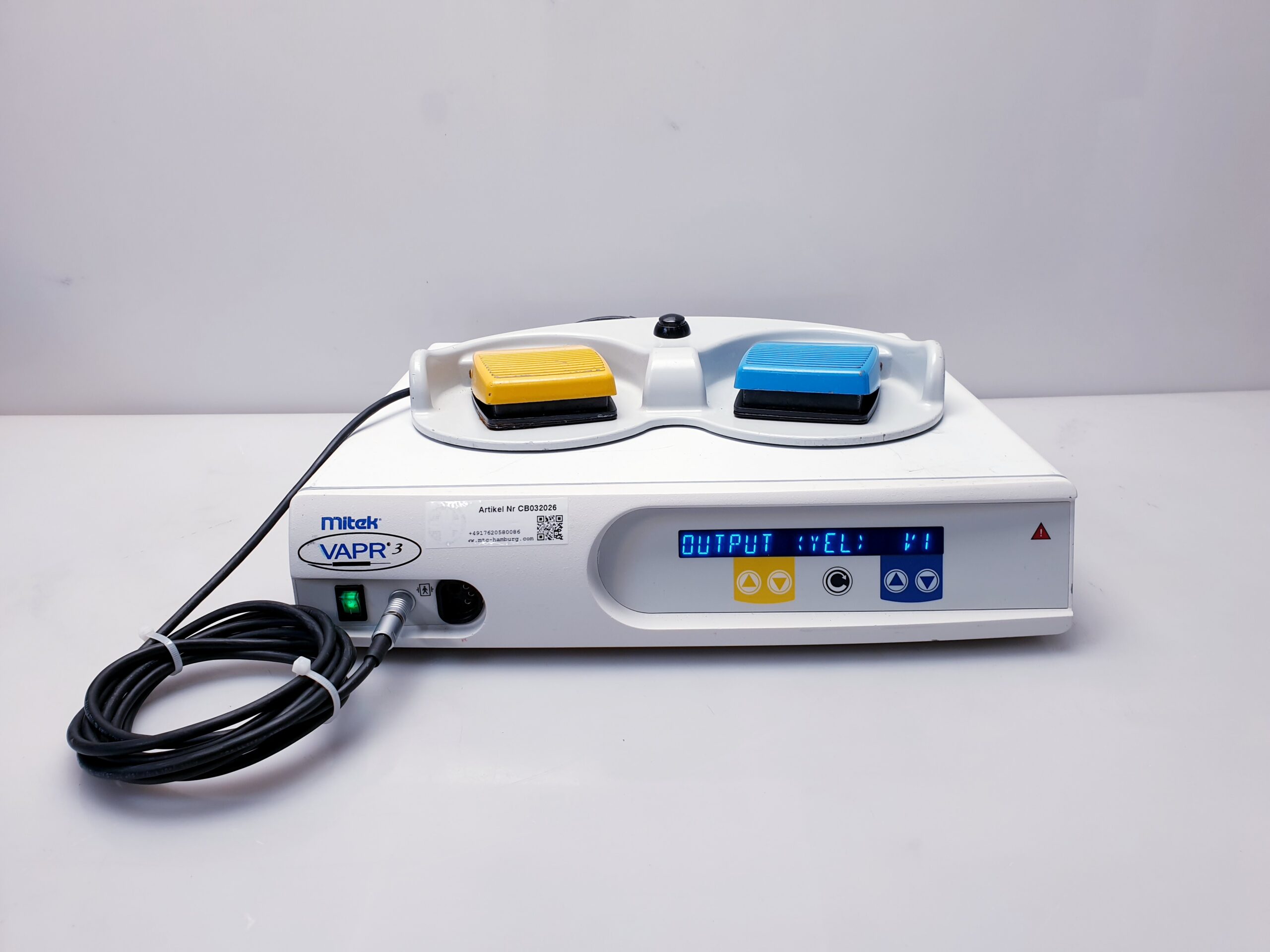 Der DePuy Mitek VAPR 3 ist ein Hochfrequenzgenerator, der in der arthroskopischen Chirurgie und anderen minimal-invasiven Verfahren eingesetzt wird. Er wird häufig zur Gewebeablation, Koagulation und zur Unterstützung bei chirurgischen Eingriffen verwendet. Hier sind einige der Hauptmerkmale und Vorteile des VAPR 3 Generators sowie der Fußsteuerung (Foot Control):