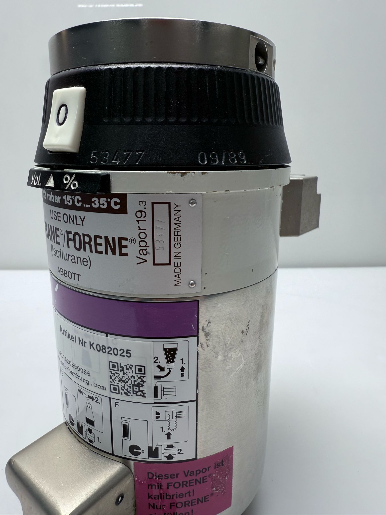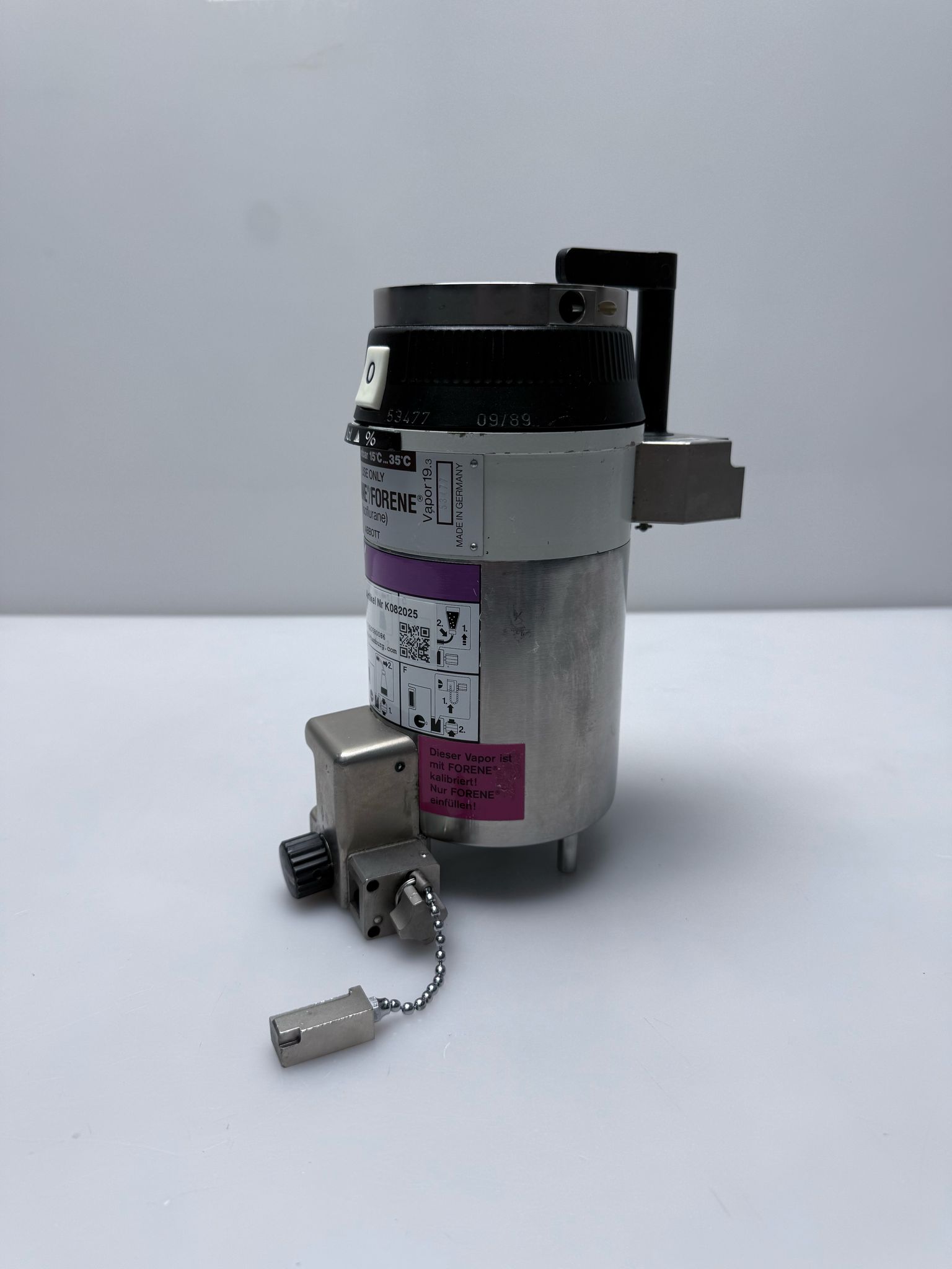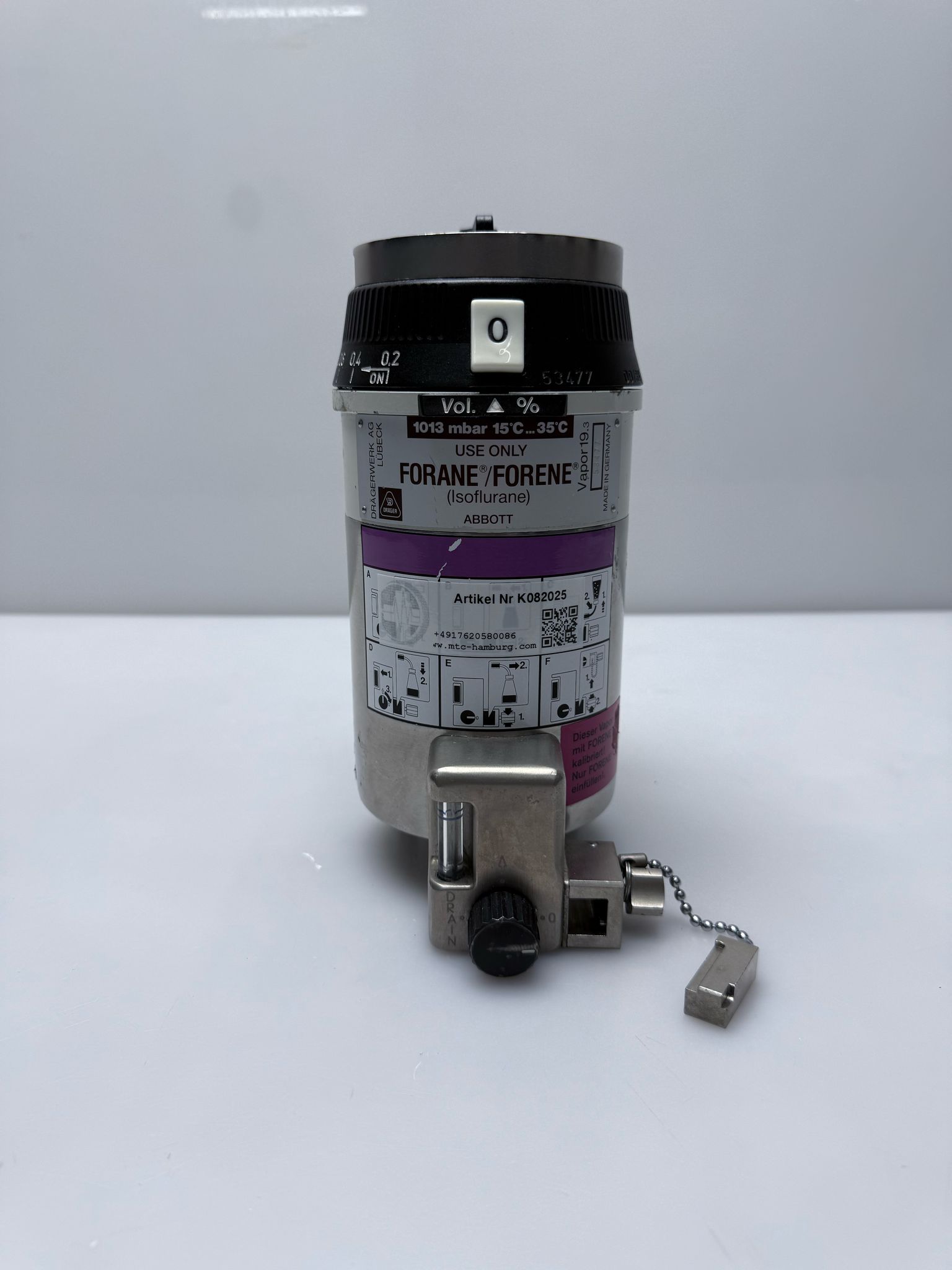 Der Vapor 19.3 sollte ausschließlich mit Isofluran (Forane) verwendet werden, um eine korrekte Funktion und Dosierung zu gewährleisten. Regelmäßige Wartung und Kalibrierung durch qualifiziertes Fachpersonal sind notwendig, um die Genauigkeit und Sicherheit des Verdampfers dauerhaft sicherzustellen.