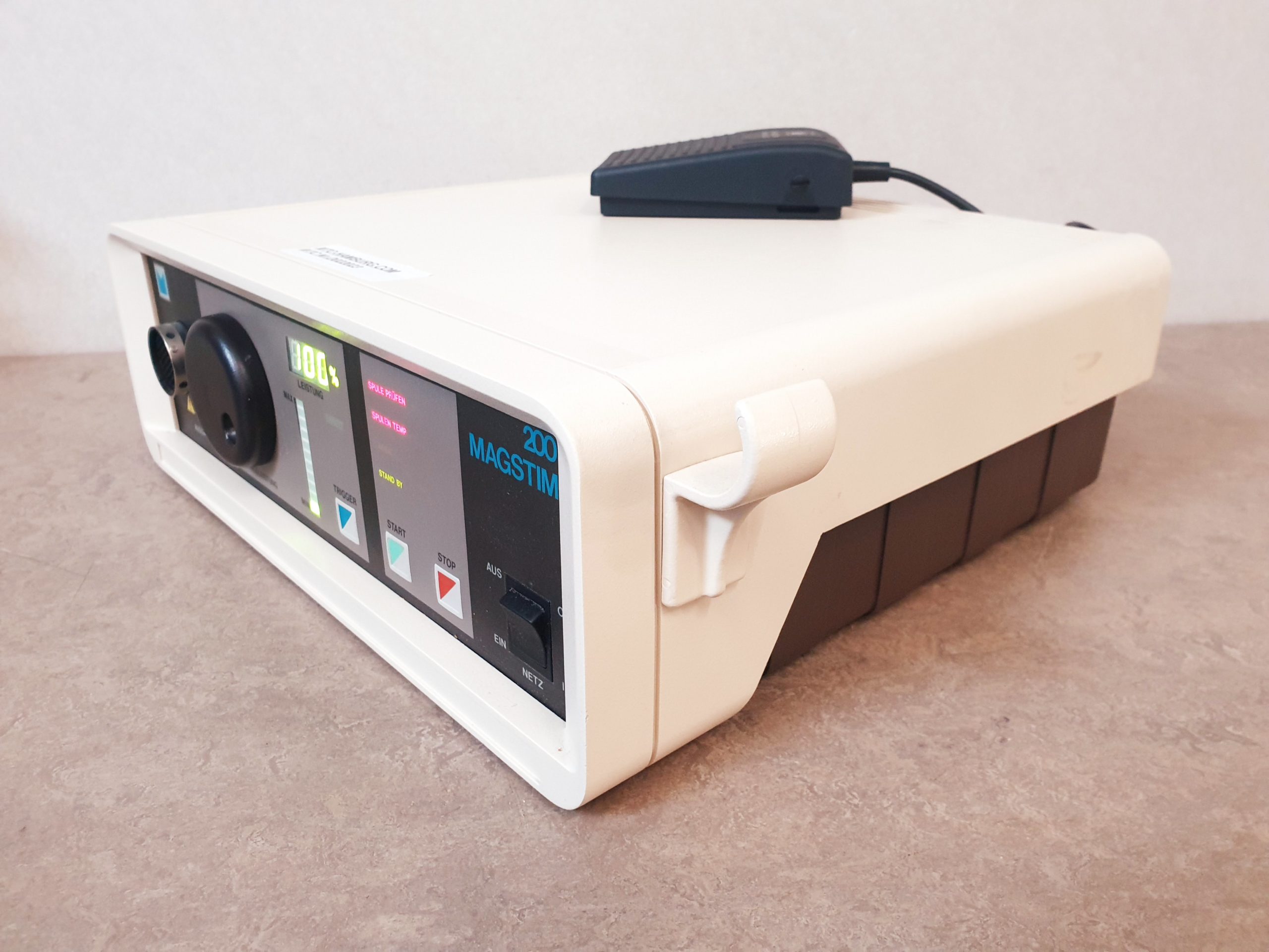 - Leistungsstarke Magnetstimulation: Der Magstim 200 erzeugt starke, kurzzeitige Magnetimpulse mit hoher Feldstärke, die eine gezielte Aktivierung neuronaler Strukturen gewährleisten.