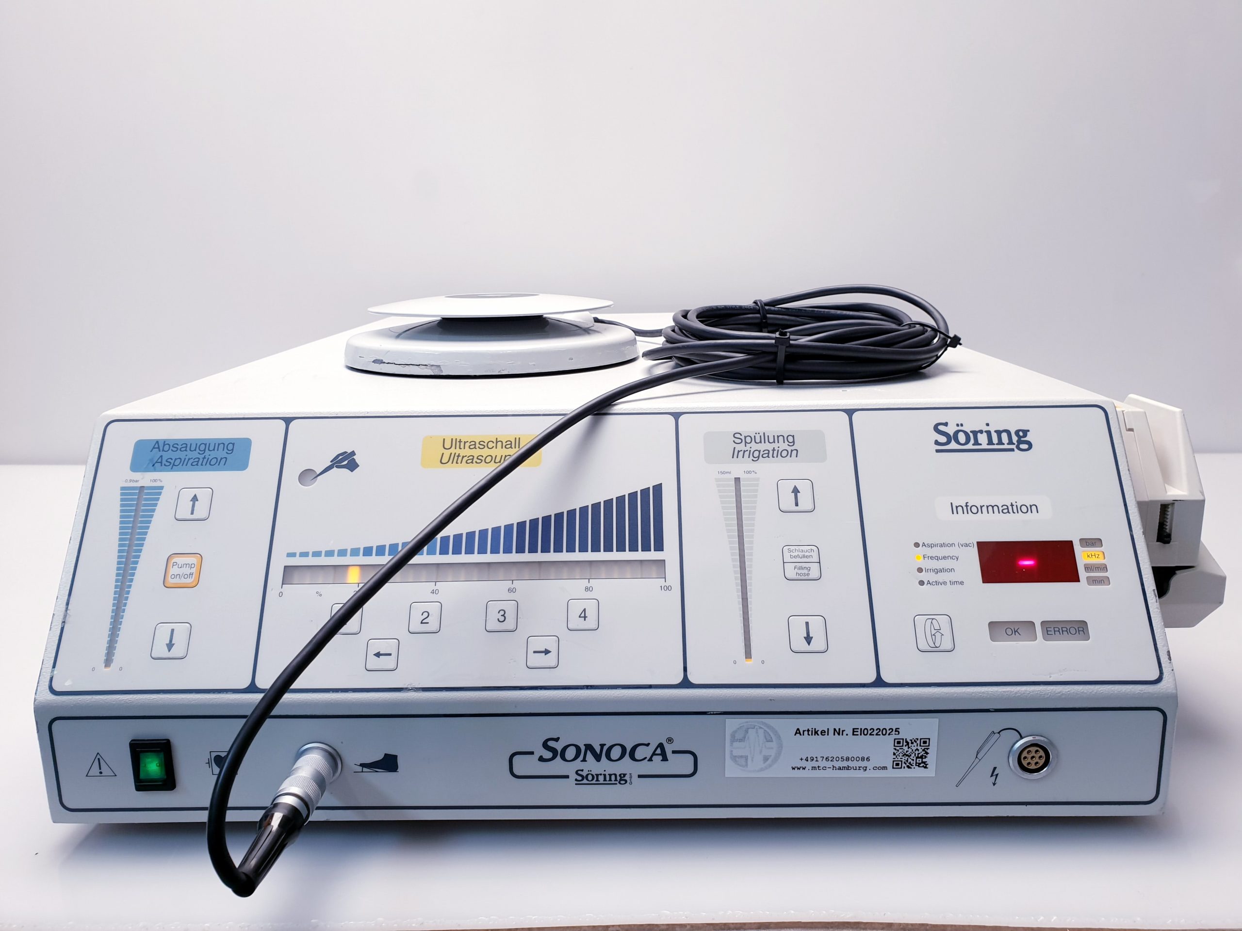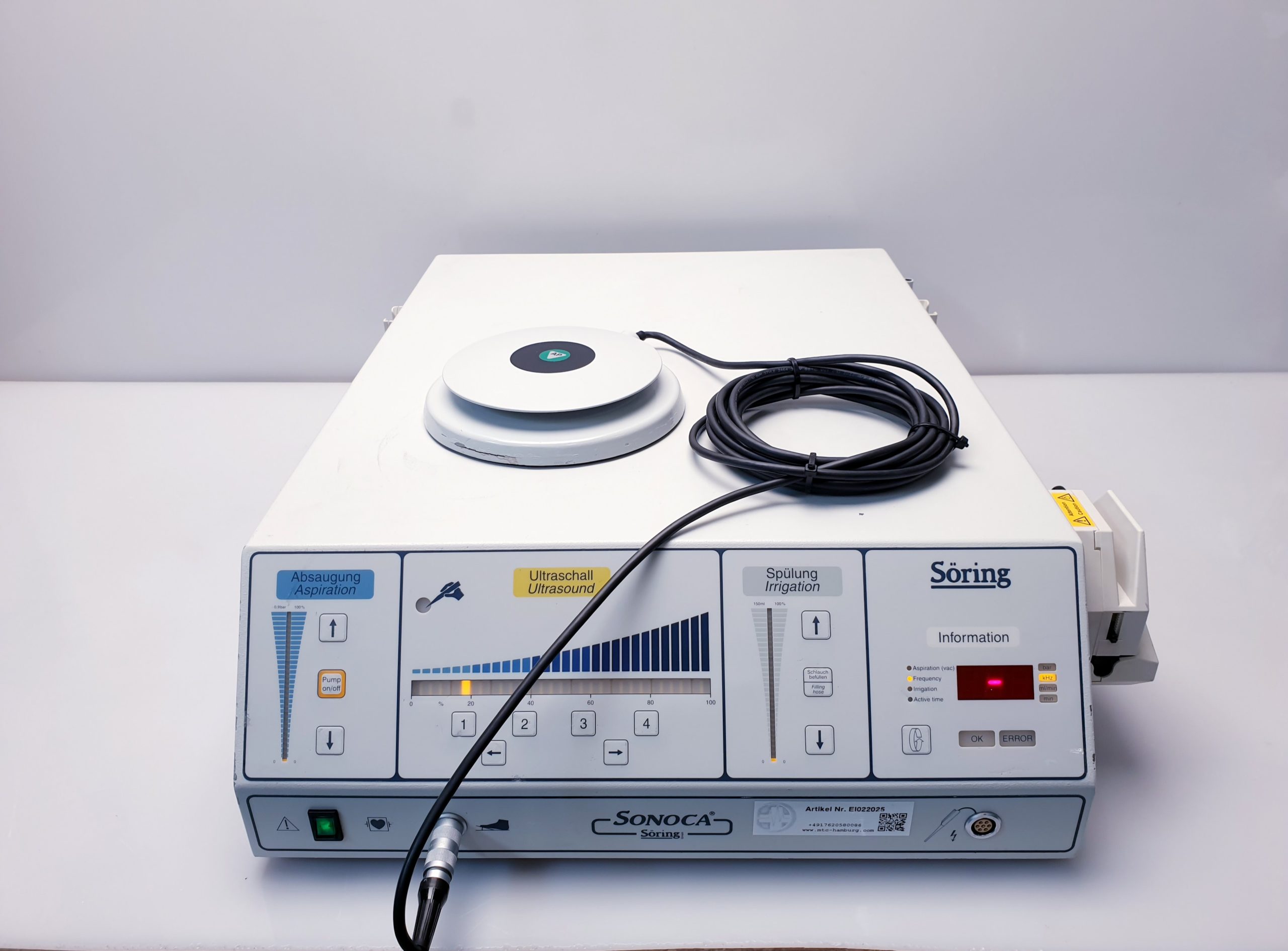 Der Soering Sonoca 300 Ultraschallgenerator stellt eine zuverlässige und innovative Lösung für chirurgische Eingriffe dar, bei denen eine schonende und präzise Aspiration von Gewebe entscheidend ist. Seine fortschrittliche Technologie unterstützt Mediziner dabei, Behandlungsabläufe zu optimieren und bestmögliche Patientenergebnisse zu erzielen.